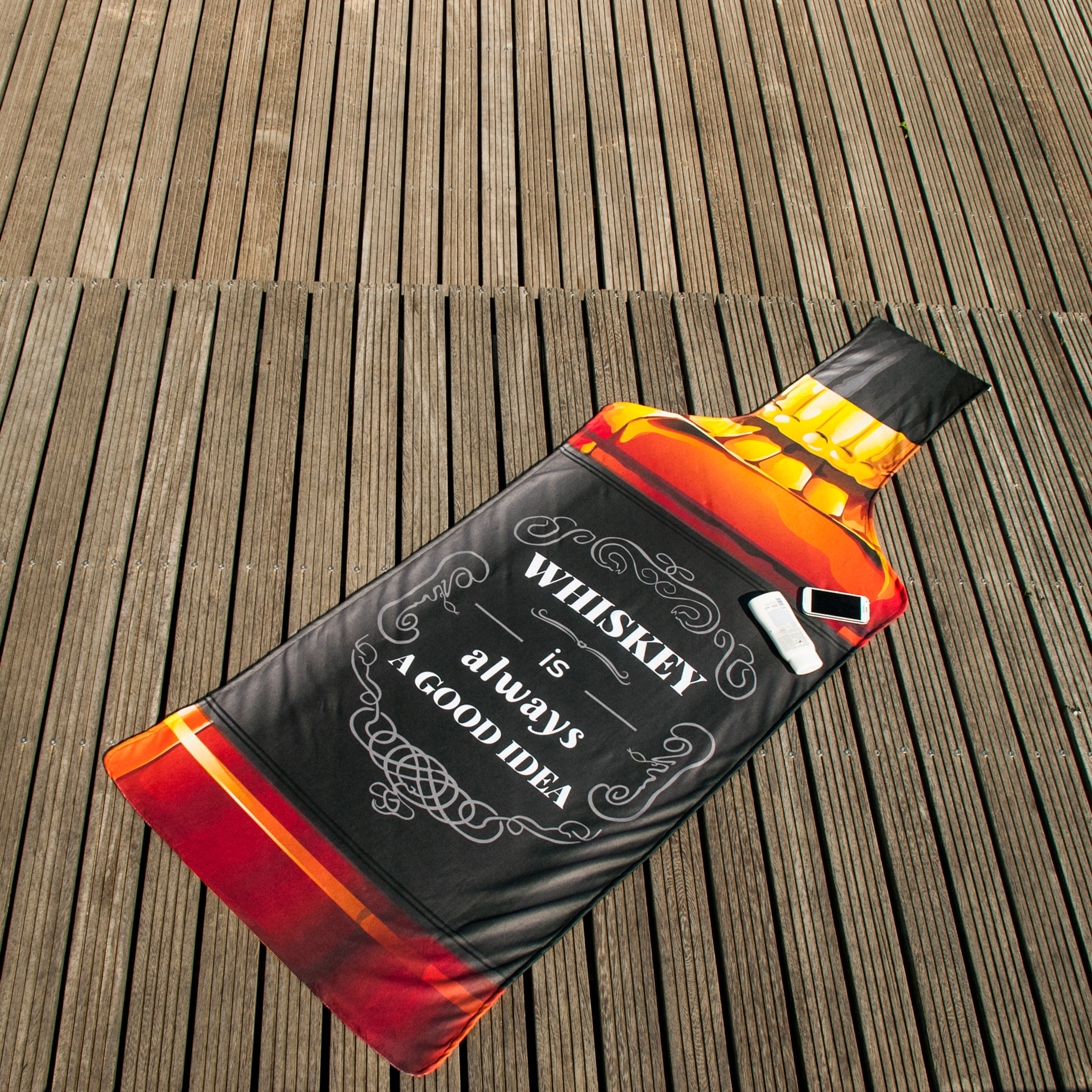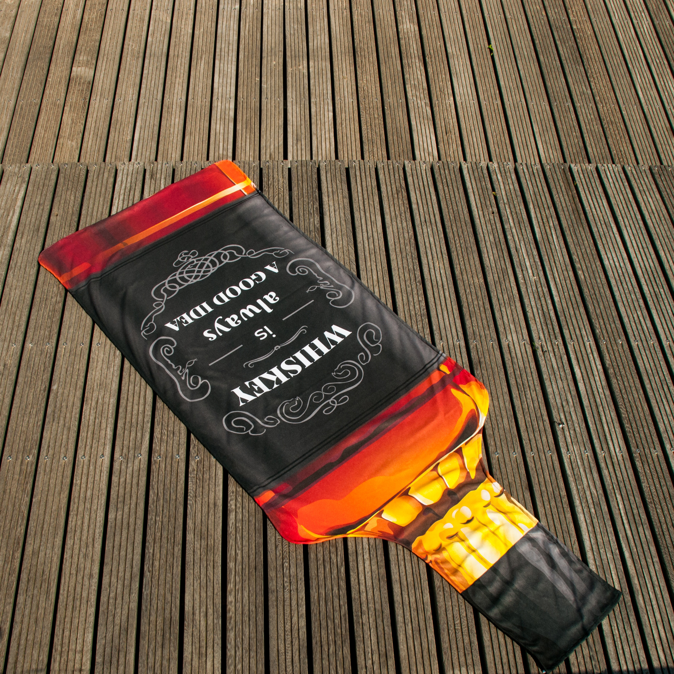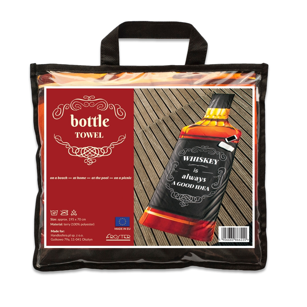 Brisača v obliki steklenice viskija je zabavna in izvirna brisača za na plažo, ki bo zagotovo pritegnila pozornost vseh na obali.