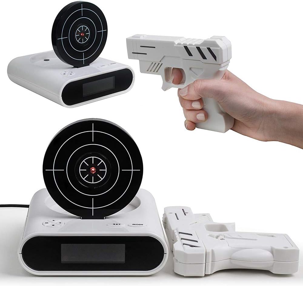 Budilka Snajper je ustvarjena za vse, ki jim gumb dremež ne pomaga več. Ko se alarm sproži, ga ne moreš kar izklopiti – najprej moraš zadeti tarčo s priloženo pištolo, in to dovolj natančno. Če si zjutraj zaspan, ti ne bo lahko – ampak ravno zato je ta budilka tako zabavna in učinkovita.