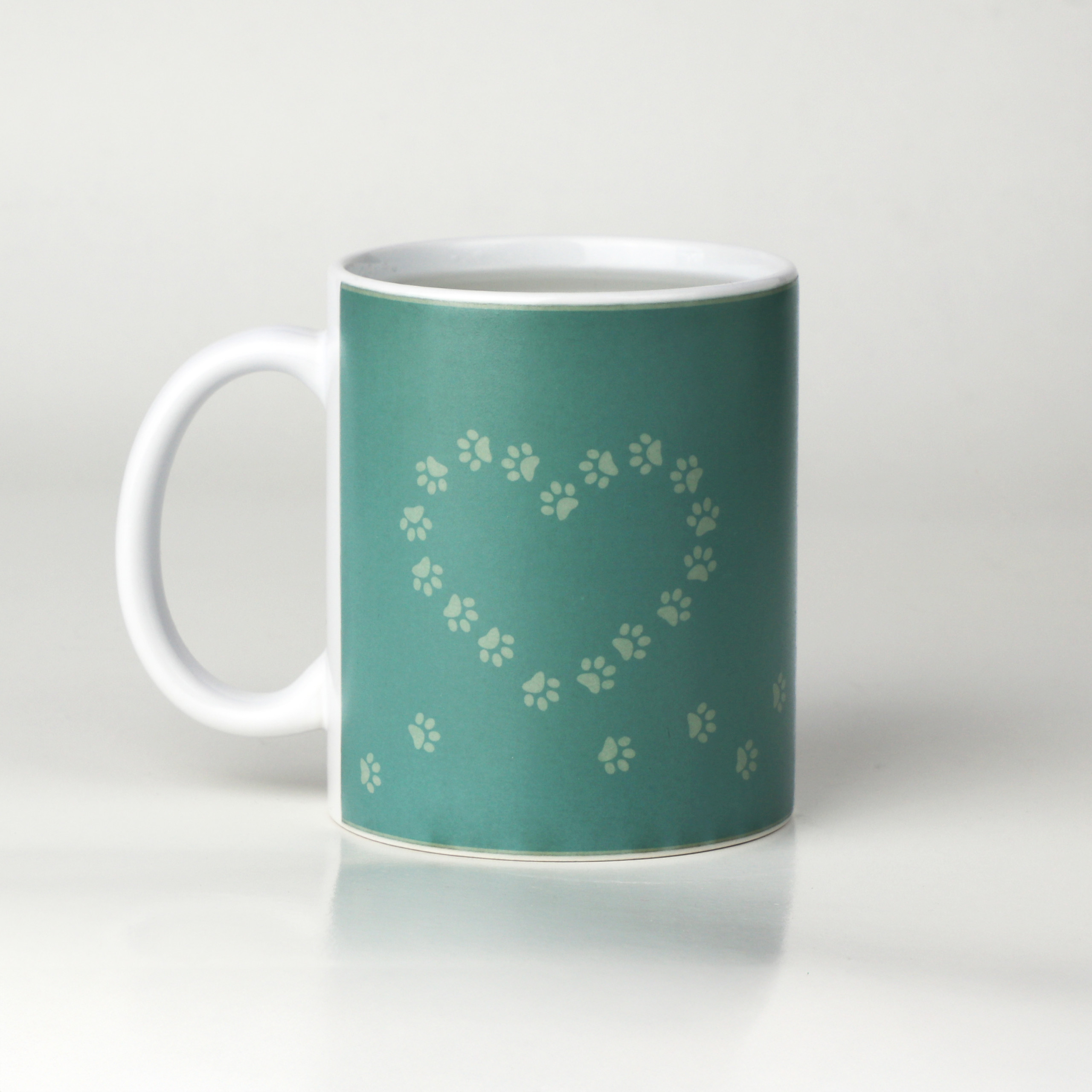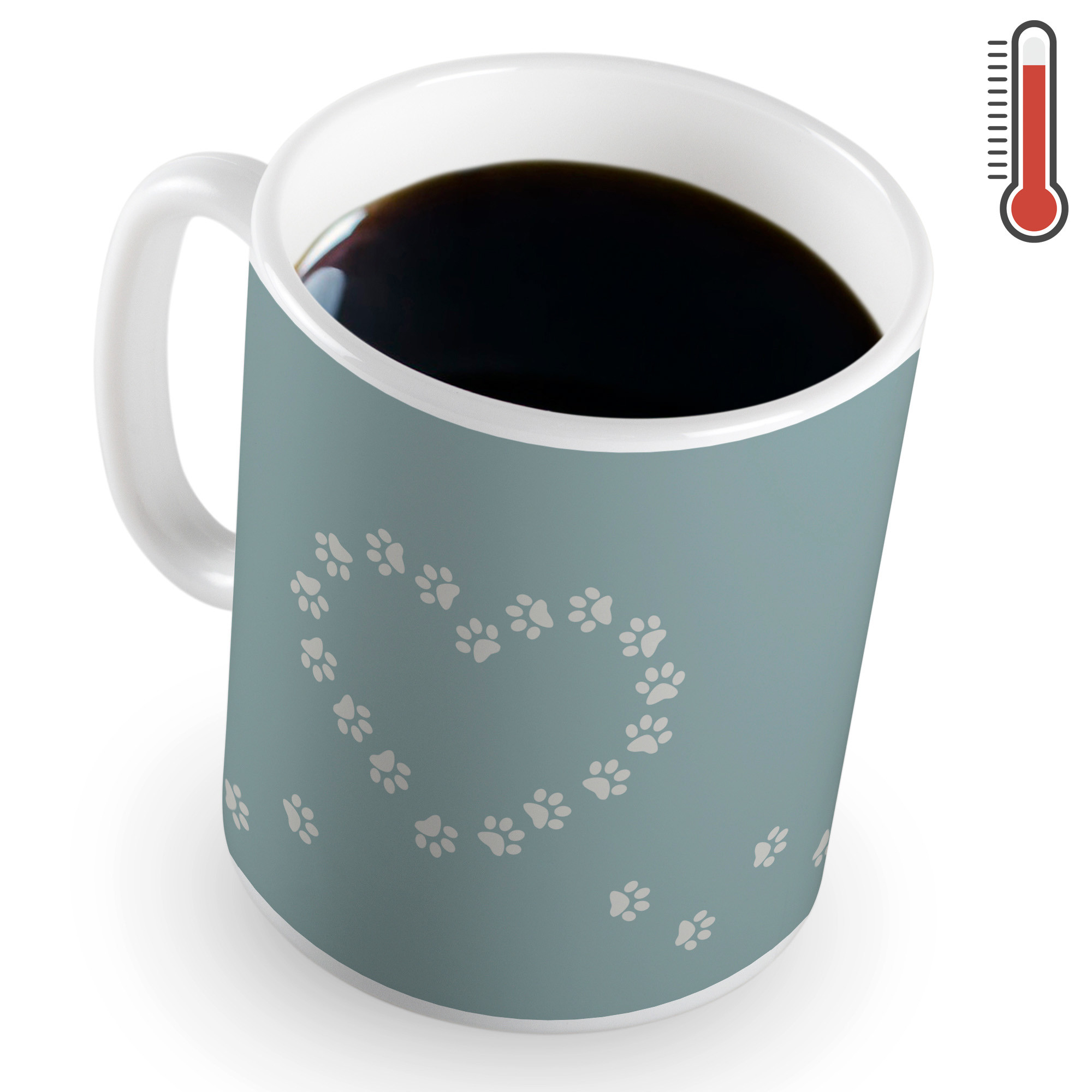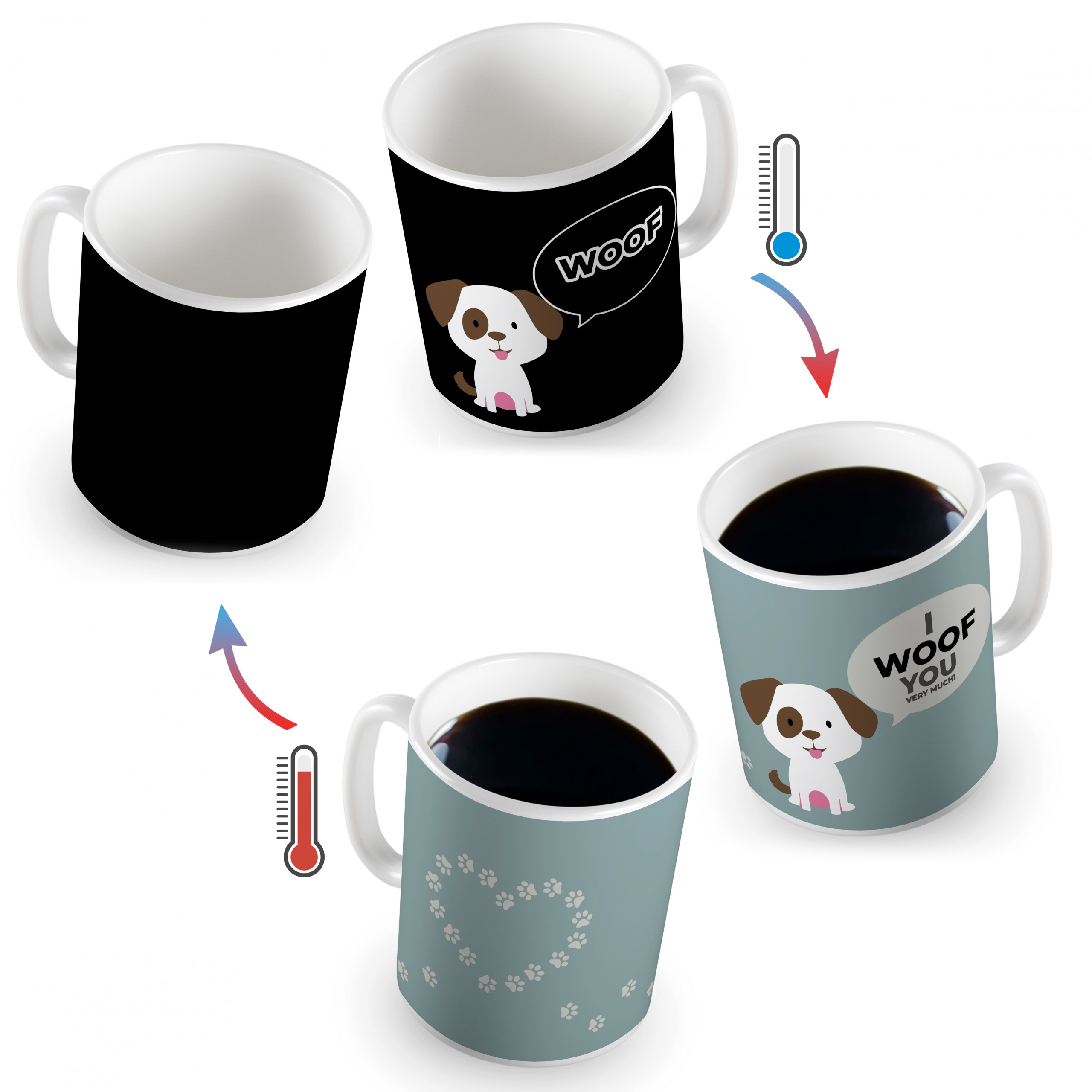 Ko se skodelica segreje, se njen videz popolnoma spremeni – na eni strani se pokaže napis “I woof you very much”, na drugi pa se pasji tački spremenita v obliko srca. ❤️