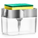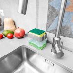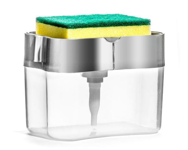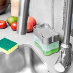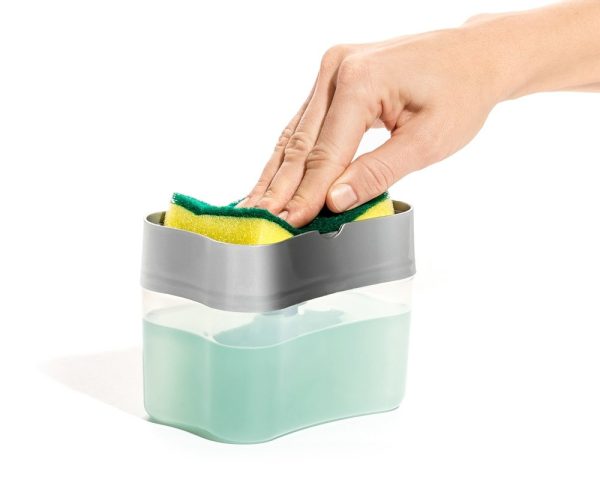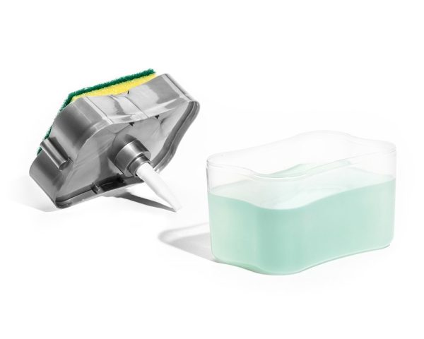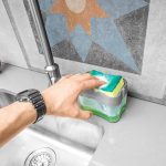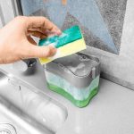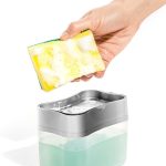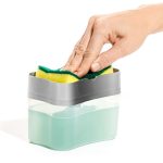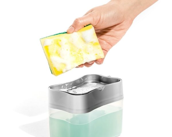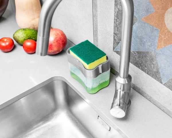 Preprosto pritisnete zgornjo ploščico, in dozirnik spusti ravno pravšnjo količino detergenta neposredno na gobico. Zraven lahko shranjujete tudi druge pripomočke – gobice, krpe, čistilne žičke – vse na enem mestu, urejeno in elegantno.