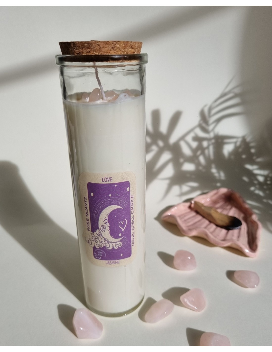 Vnesite toplino, romantiko in ljubezensko energijo v svoje življenje s posebno energijsko svečo za ljubezen. Ta sveča je ustvarjena za privabljanje ljubezni, poglabljanje odnosov in krepitev čustvene harmonije, saj združuje moč kristalov roževca in zapeljiv vonj jasmina.