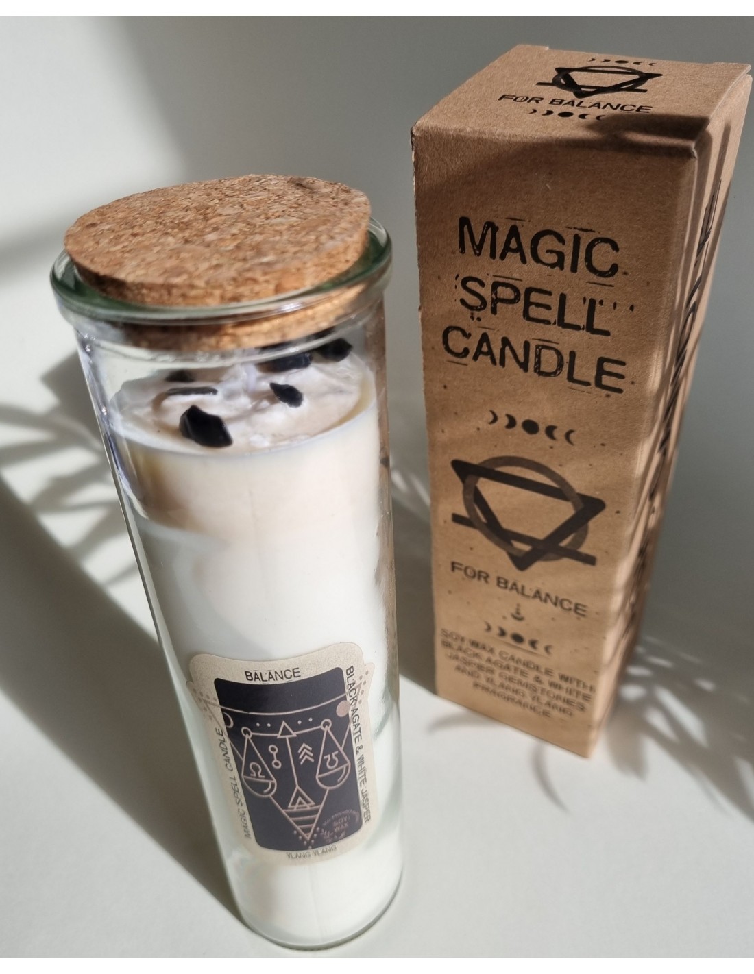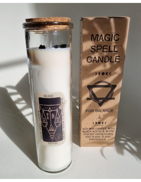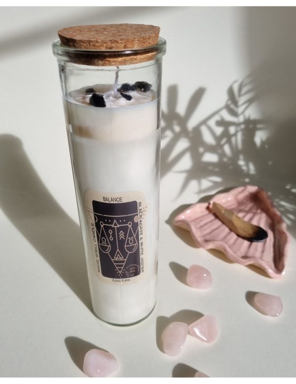 Vzpostavite notranjo harmonijo, stabilnost in mir s posebno energijsko svečo za ravnovesje. Ta dišeča sveča je ustvarjena za obnovitev čustvene in duhovne uravnoteženosti, saj združuje zaščitno moč črnega ahata, pomirjujoč učinek belega jaspisa ter sproščujoč vonj ylang-ylanga.