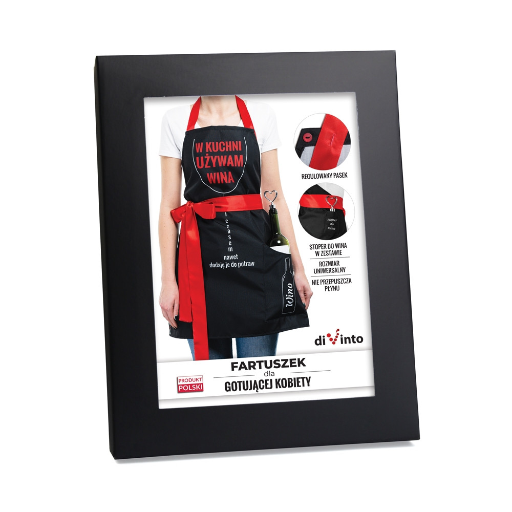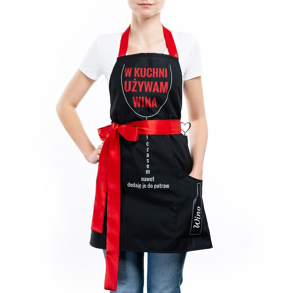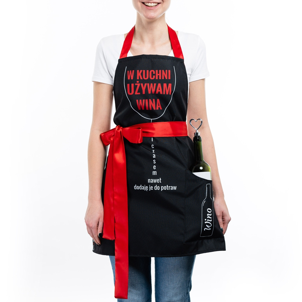 Added to the set: wine stopper. It is ready for giving it as a gift, no extra packaging is needed. Inscription on the product: W kuchni używam wina, czasem nawet dodaję je do potraw. Product in the Polish language version. Material: polyester with a liquid reflective coating. Strong and waterproof fabric. Resistant to dirt. Dimensions: 68,5 cm (length), 61 cm (width), one size fits all, the size can be adjusted, adjustable neck strap. Very strong seams. It can be washed in temperature 30 Celcius degrees. WARNINGS: Keep away from fire! Dimensions in the package: 3,0 x 20,5 x 26,5 (cm). Weight: 0,28 kg. Made in EU.