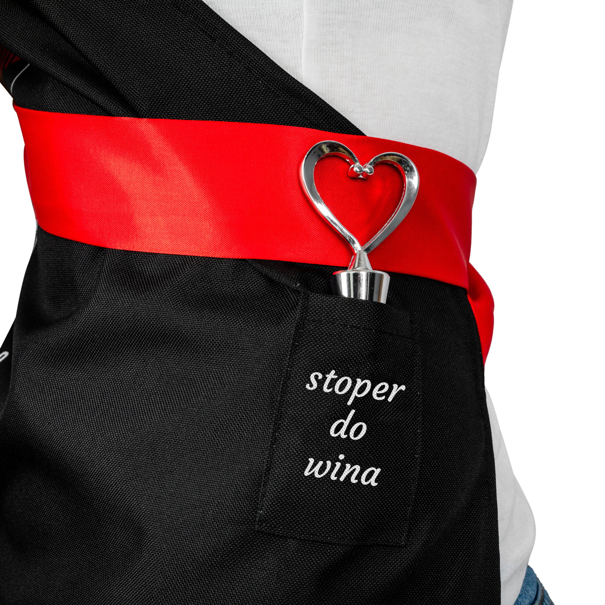 A kitchen apron with a pocket for wine bottle. A heart-shaped wine stopper included.