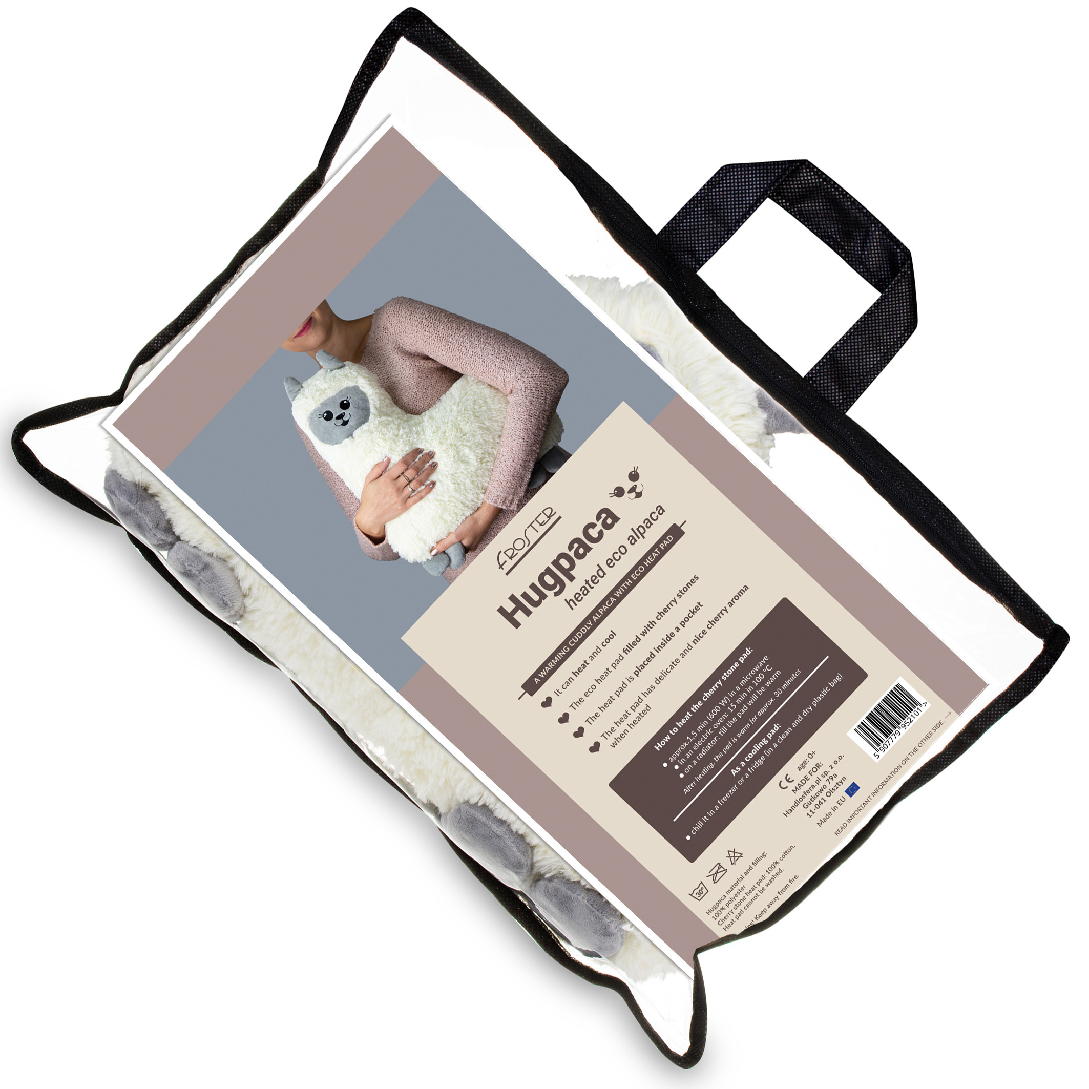 Hugpaca – grelna lama s toplim srcem je čudovita, mehka in objemljiva plišasta igrača z ekološko grelno blazinico.
