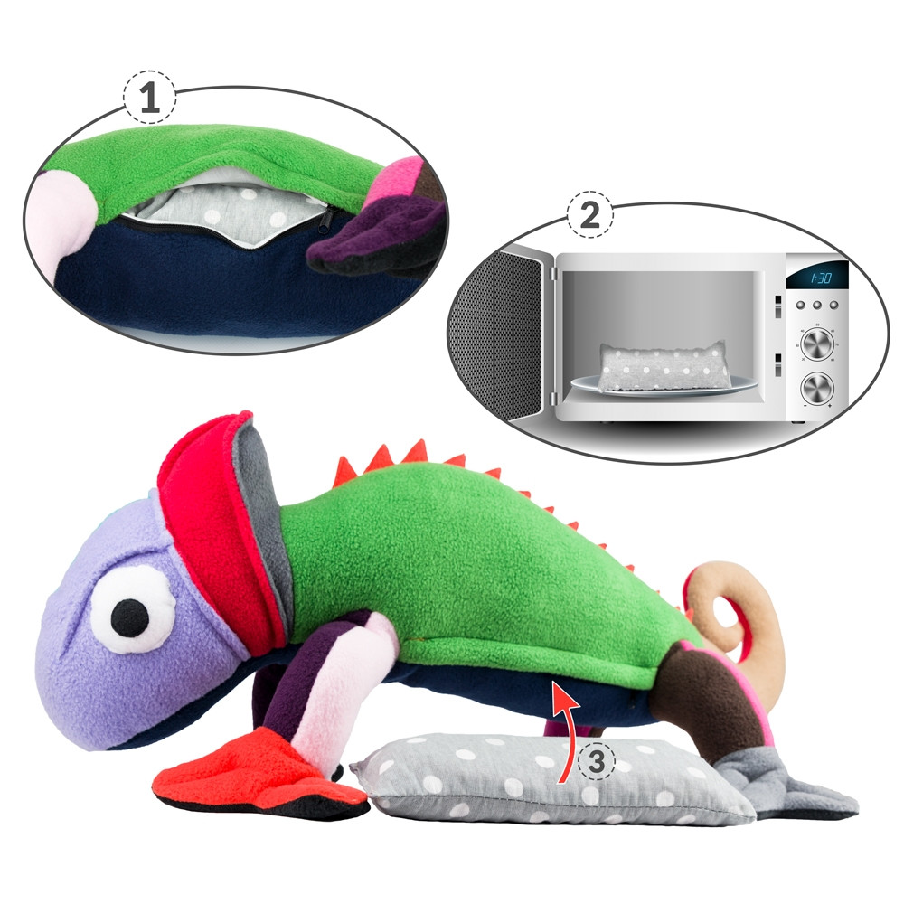 Grelni kameleon je prijetna in zabavna plišasta blazina z ekološko grelno blazinico, ki ogreje telo in sprosti mišice.