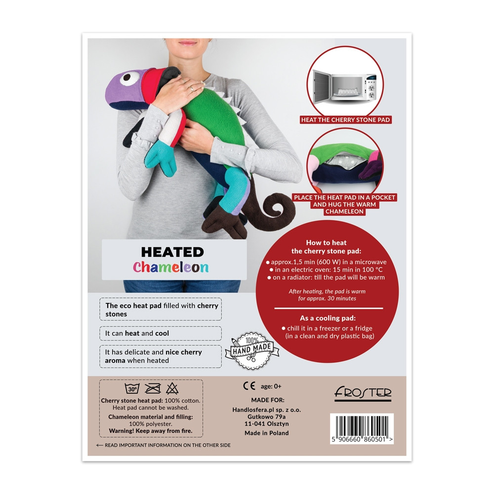 Ko jo segrejete v mikrovalovni pečici, kameleon postane topel in pomirjujoč spremljevalec – idealen za hladne dni, sproščanje ali objemanje.