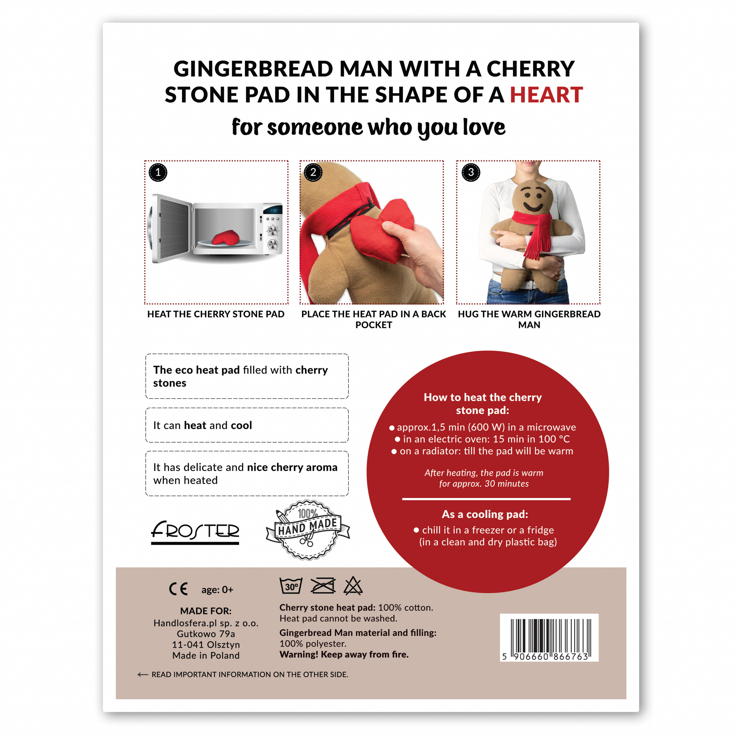 Ta plišasti medenjak skriva v sebi ekološko grelno blazinico v obliki srca, napolnjeno s češnjevimi koščicami, ki po segrevanju oddajajo nežno toploto in blag vonj po češnjah.