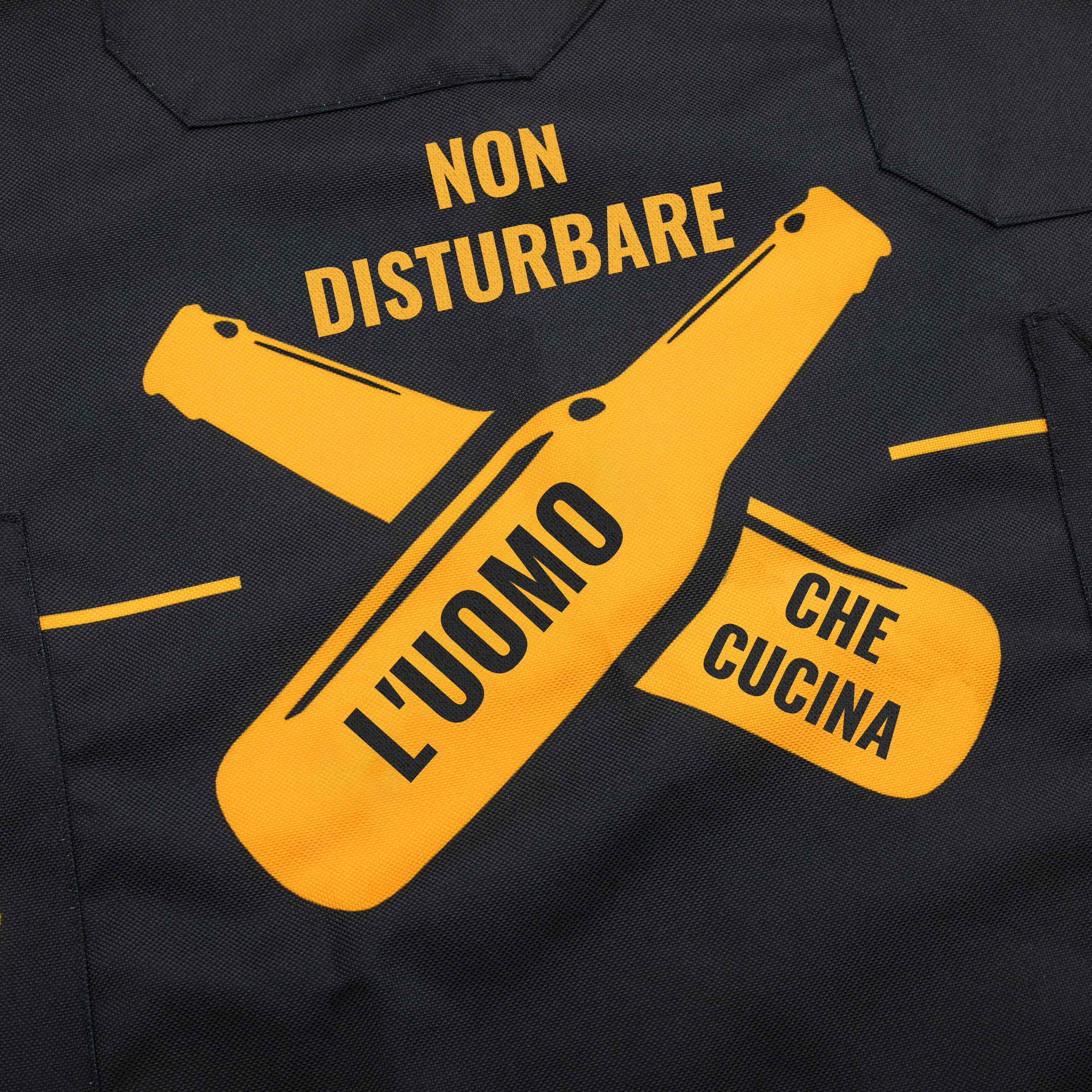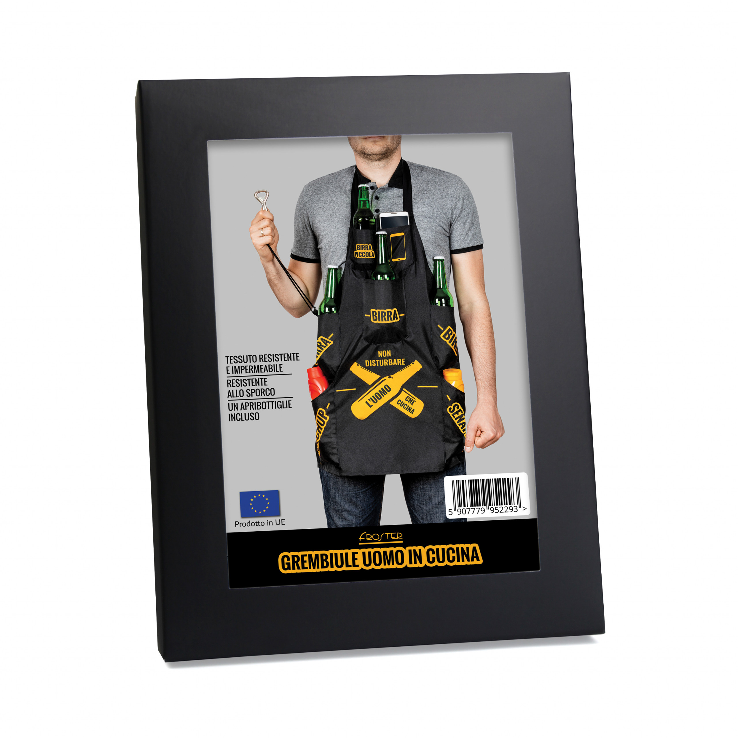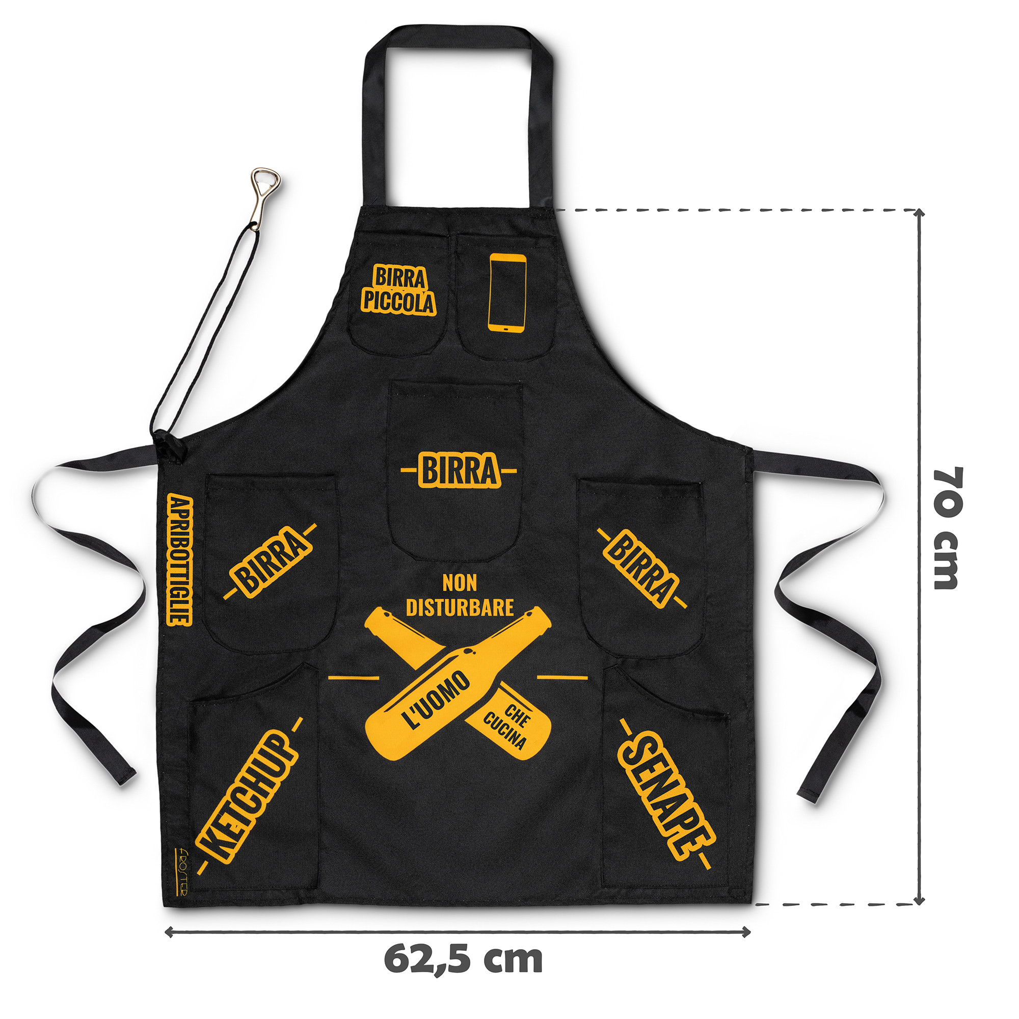 The apron pockets will hold: 3 beers (0,5 l bottle), one small beer, a bottle opener, phone, mustard and ketchup. Added to the set: bottle opener. It is ready for giving it as a gift, no extra packaging is needed. Inscription on the product: Non disturbare l’uomo che cucina. Product in the Italian language version. Material: polyester with a liquid reflective coating. Strong and waterproof fabric. Resistant to dirt. Dimensions: 70 cm (length), 62,5 cm (width), one size fits all, the size can be adjusted. Very strong seams. It can be washed in temperature 30 Celcius degrees. WARNINGS: Keep away from fire! Dimensions in the package: 3,0 x 20,5 x 26,5 (cm). Weight: 0,23 kg. Made in EU.