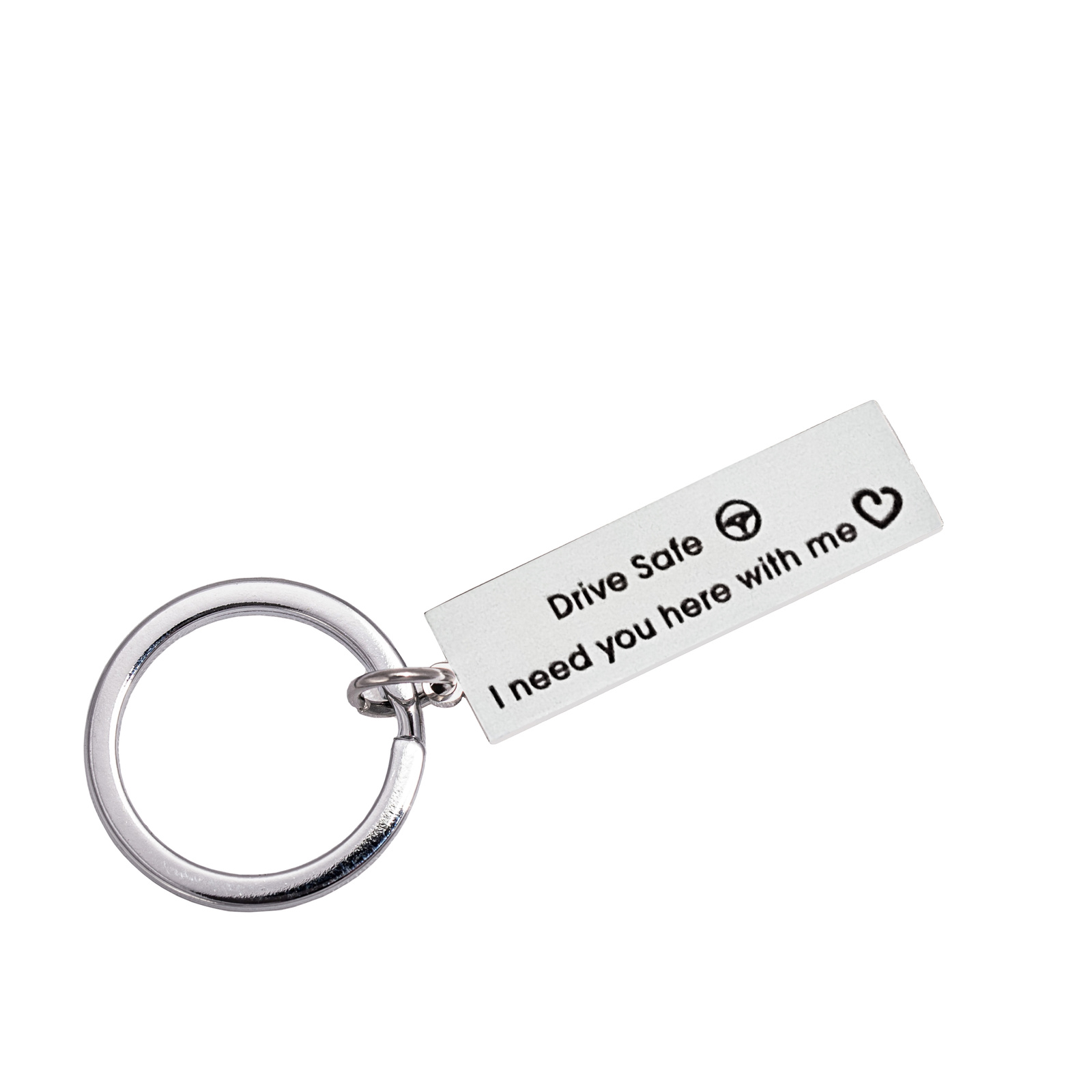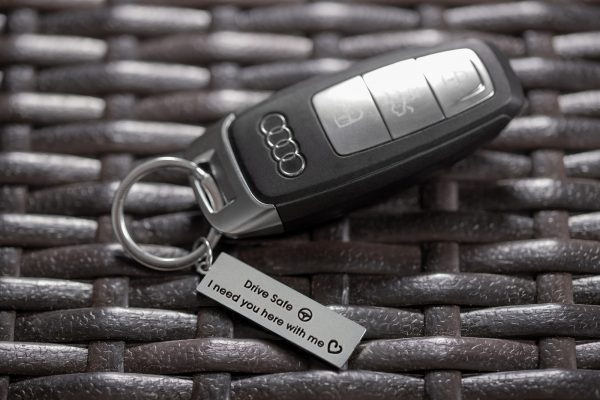 Obesek z vgraviranim sporočilom “Vozi varno – potrebujem te ob sebi”. Ljubeče darilo za partnerja, prijatelja ali družinskega člana.