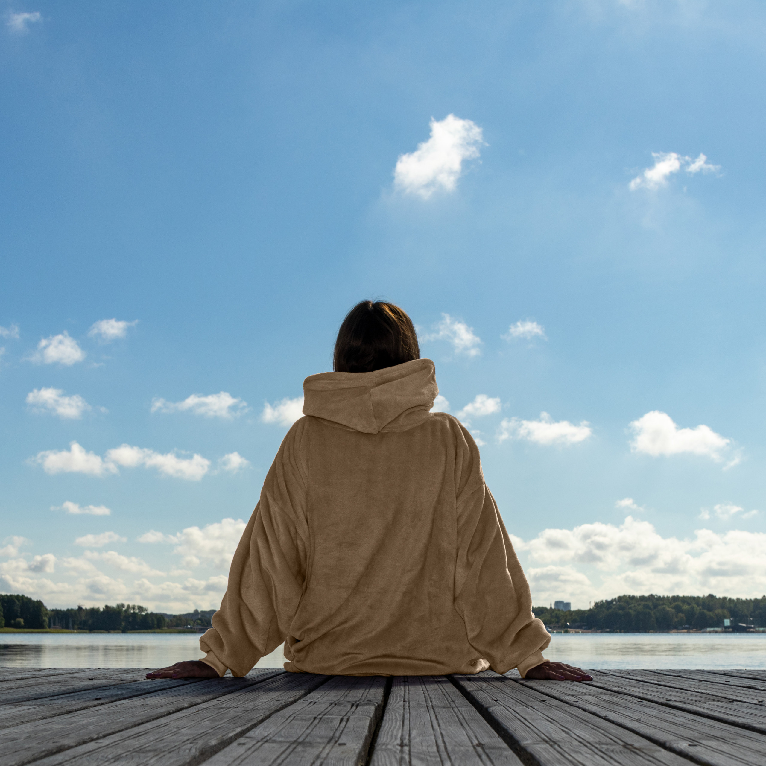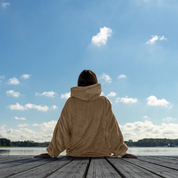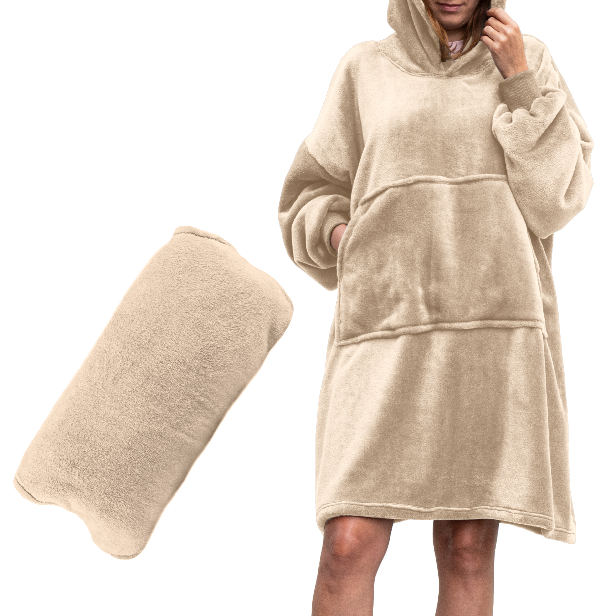 Univerzalna velikost za vse! Mehka in topla pulover & odeja s kapuco 4v1 v nežni bež barvi združuje toplino odeje, udobje puloverja, praktičnost kopalnega plašča in priročnost blazine. Zaradi oversize kroja (XXL) se prilega vsem postavam in ponuja popolno udobje v vsakem trenutku.