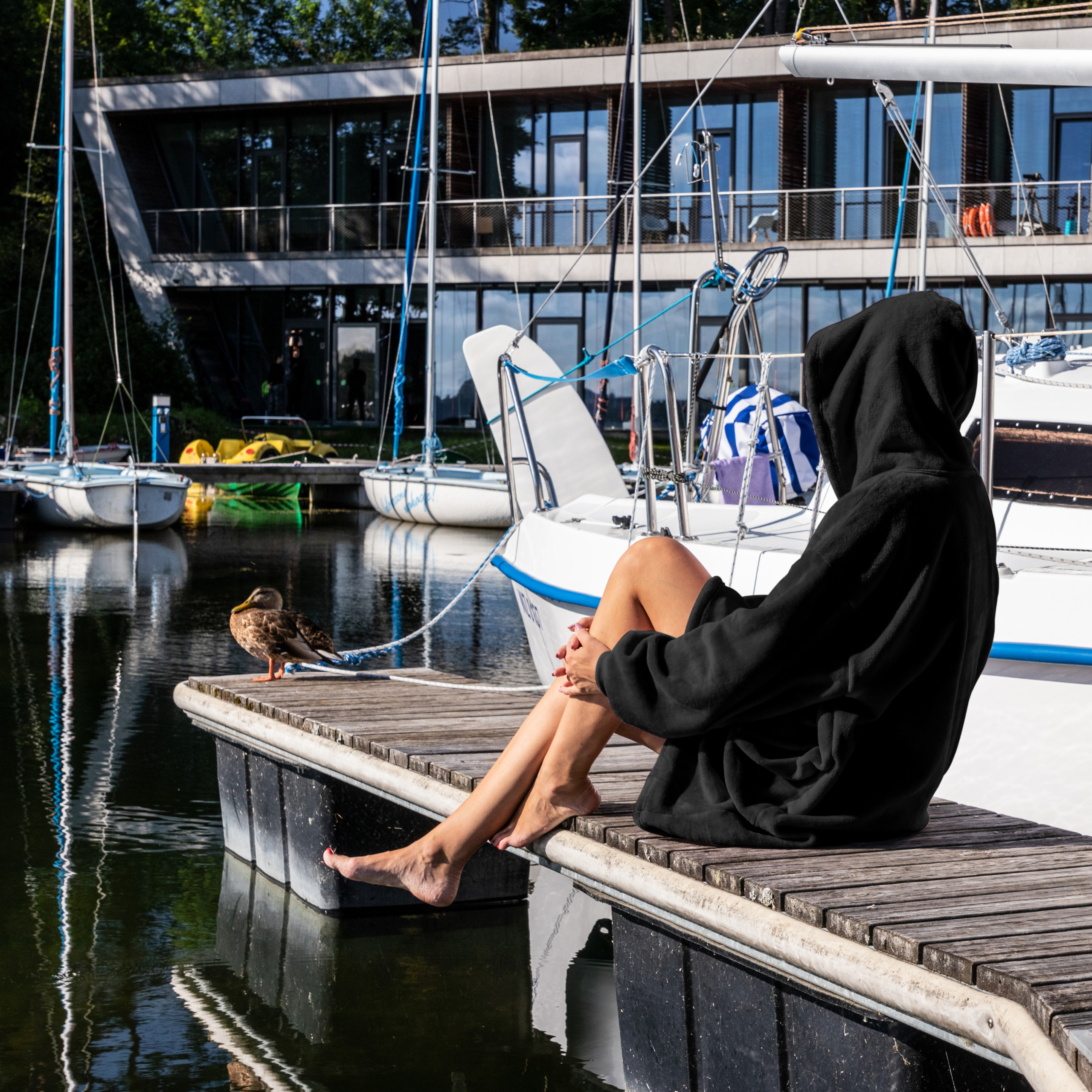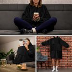Univerzalna velikost za vse! Mehka in topla pulover & odeja s kapuco 4v1 v klasični črni barvi združuje udobje puloverja, toplino odeje, funkcionalnost kopalnega plašča in priročnost blazine. Zaradi svojega oversize kroja (XXL) in elegantnega videza je popolna izbira za vsakogar, ki si želi kombinacijo stila in udobja.
