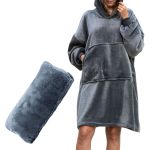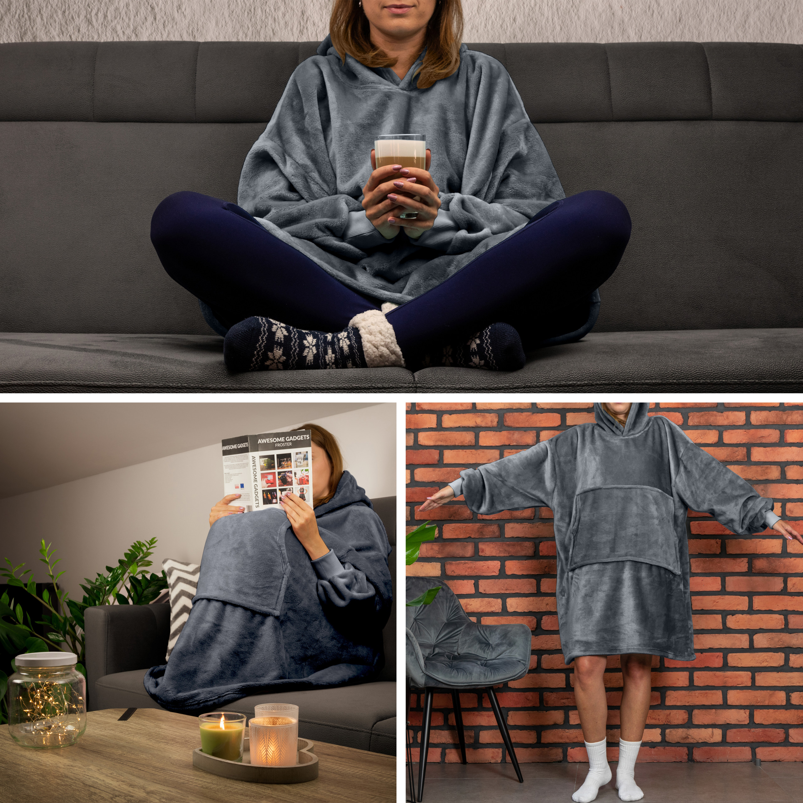 Mehka in topla pulover & odeja s kapuco 4v1 v elegantni sivi barvi je popolna kombinacija udobja, topline in praktičnosti. Združuje kar štiri funkcije v enem izdelku – odeja, pulover, kopalni plašč in blazina.