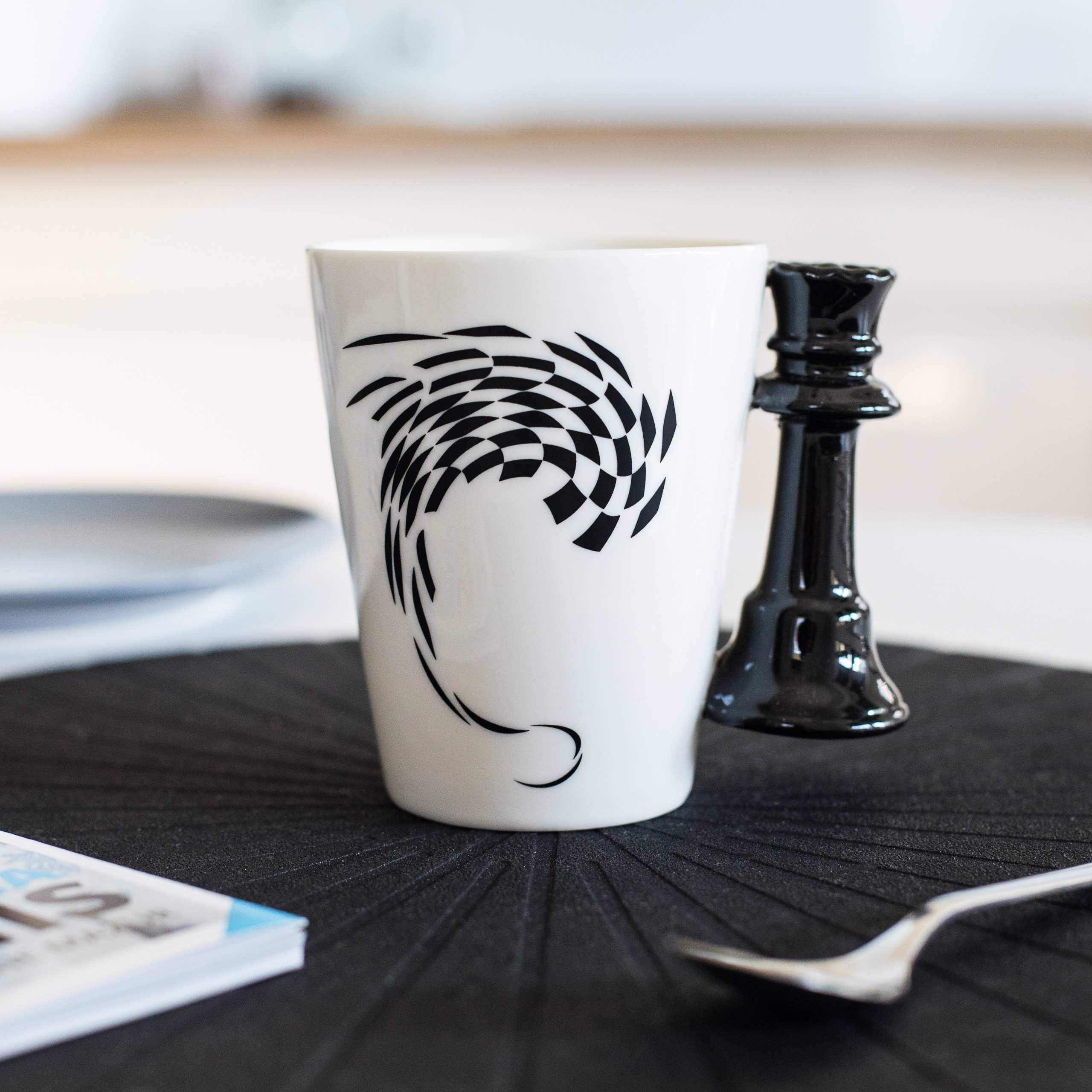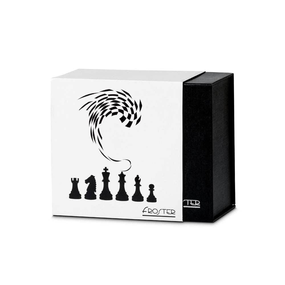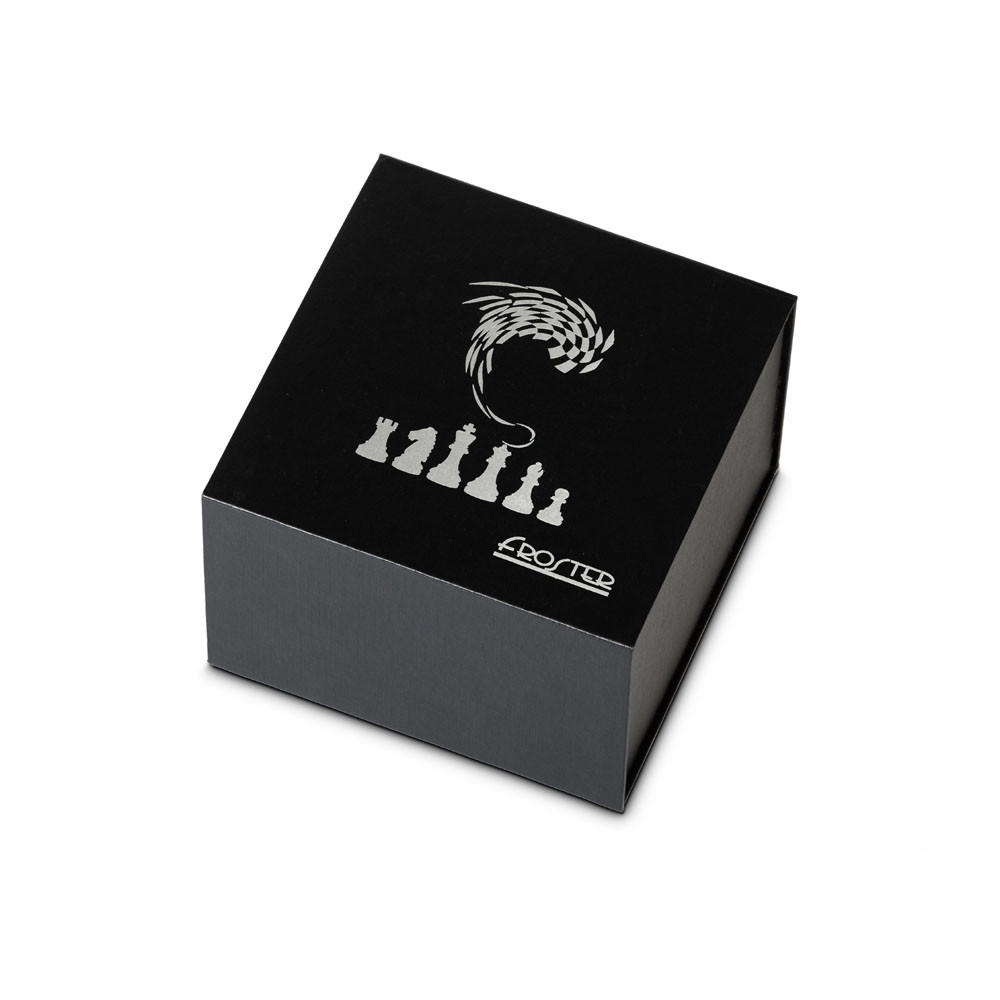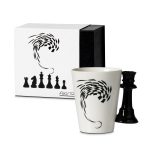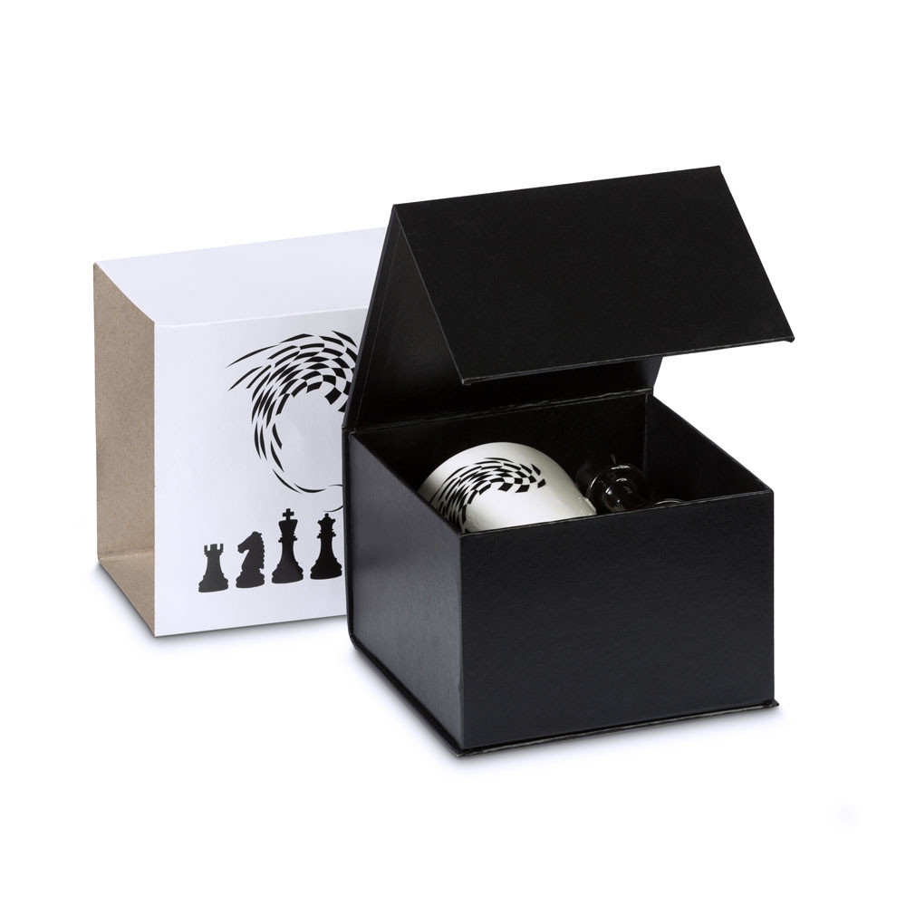 Vsaka skodelica je zapakirana v elegantno črno darilno škatlo z magnetnim zapiranjem in šahovskim motivom.