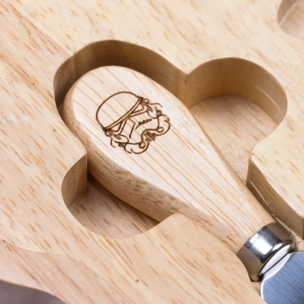 Ikonična deska za sir v obliki Stormtrooper čelade z noži. Odlično darilo za ljubitelje Star Wars in vse, ki radi postrežejo z galaktičnim stilom.